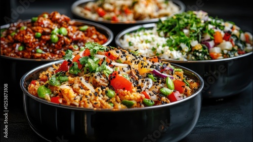 Delicious Asian rice bowls, food photography, restaurant meal