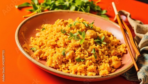 Delicious Asian Rice Dish With Chicken And Basil On Orange Table