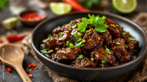 stew, beef, pork meat, asian cuisine, glazed, ceramic, green onion, garnish, cooking, cookery, meal, dinner, lunch, savoury, delicious, epicure, food photography, eatery, homemade, comfort food, traditional, spicey, sweet, lemony, sauce, meat, protein, healthy, diet, nourishment, culinary, presentation, main course, side dish, ingredient, receipe, eating, serving, kitchen, rustic, dark background, lime, chili, spoon, closeup