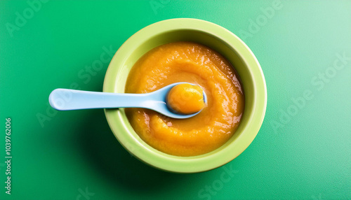 Delicious baby food with spoon in bowl on green table, top view