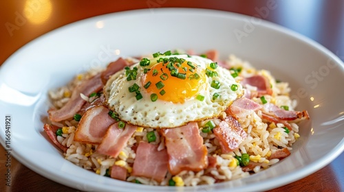 Delicious Bacon and Egg Fried Rice on White Dish