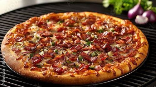Delicious bacon pizza with red onion and peppers on a black metal pan. It can be used for menu design or advertising related to food.