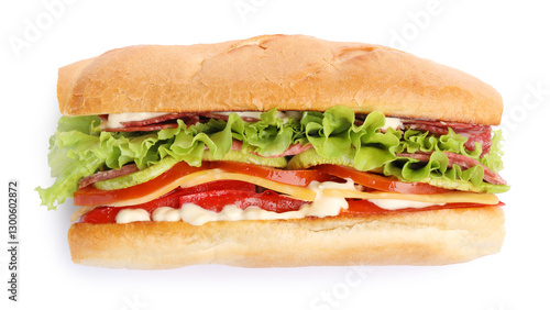 background, baguette, bread, calorie, cheese, cook, cooking, culinary, cut, delicious, diet, dinner, eat, food, fresh, gastronomy, epicure, half, healthy, homemade, ingredient, isolated, lettuce, lunch, natural, nutrient, nourishment, object, organic, picnic, receipe, salami, sandwich, sauce, sausage, snack, take-away, take-out, tasty, tomatoes, top, view, white, deliciously