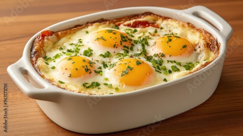 Delicious baked eggs with a golden yolk, garnished with fresh herbs, served in a white casserole dish on a wooden table.