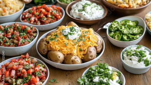 Delicious Baked Potatoes with Toppings and Fresh Ingredients Spread