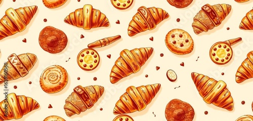 Delicious bakery seamless pattern featuring croissants, bread, and pastries on a beige background, baked, paper