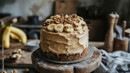 cake, dessert, banana, frosting, nut, kitchen, homemade, sweet, confectionery, pastry, food photography, delicious, creamy, wooden table, rustic, fresh, natural light, decoration, baking, treat, receipe, ingredient, culinary, indulgent, snack, comfort food, party, celebration, festive, brunch, tableware, sweet tooth, handcraft, epicure, warm tones, dairy, freshness, seasonal, organic, indulgence