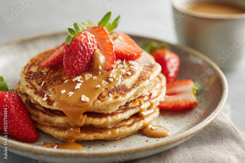 Delicious banana oat pancakes topped with fresh strawberries and creamy drizzle