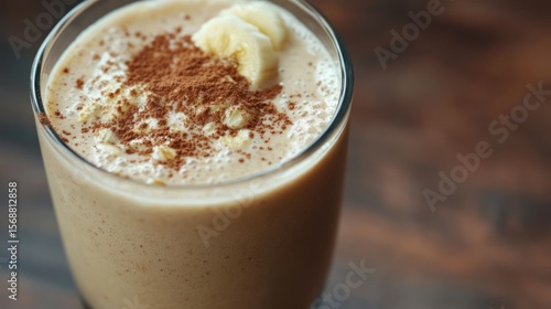 Delicious banana smoothie in a glass with chocolate powder and banana slices