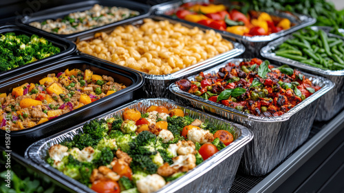 Delicious batch cooked meals arranged in trays, showcasing vibrant vegetables and pasta