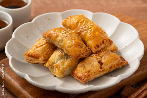 Delicious BBQ pork puff pastry dim sum food.
