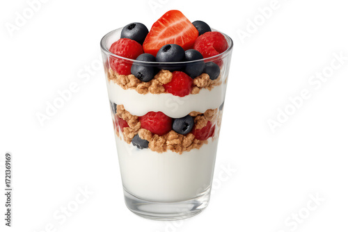 yogurt, parfait, granola, berry, blueberry, raspberry, strawberry, fruit, glasses, dessert, breakfast, snack, healthy, food, fresh, sweet, layer, creamy, crunchy, alimentary, summer, delicious, appetising, vegetarian, dairy, red, blue, white, brown, vibrant, colourful, closeup, healthy lifestyle, diet, transparent, isolated, cut-out, studio shot, clipping path, wholesome, organic, vitamin, natural