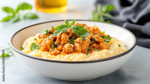 Delicious bowl of creamy polenta topped with savory meat sauce and fresh herbs, ideal for comforting meals or culinary presentations.