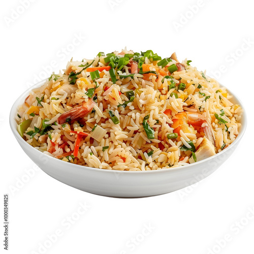 Delicious bowl of fried rice with a mix of vibrant veggies and juicy chicken, set against a see-through background