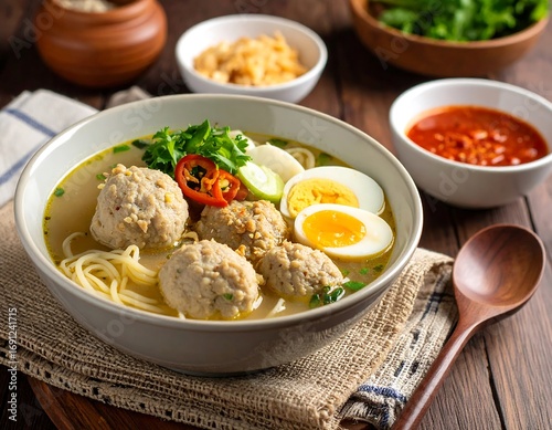 Delicious bowl of meatball soup with noodles and boiled eggs, perfect for food blogs and restaurants