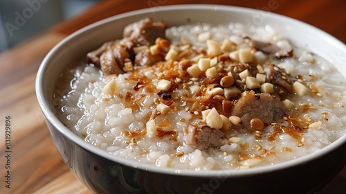 Delicious bowl of pork rice porridge topped with golden brown garlic and a sprinkle of white pepper
