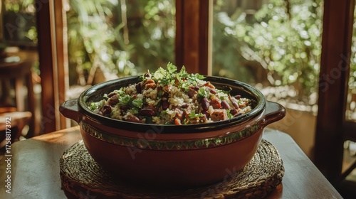 feijoada, brazilian, food, dish, bean, stew, rice, sausage, clay, pot, rustic, garnish, herb, fresh, green, black, texture, detail, close, up, macro, healthy, meal, lunch, dinner, comfort, cookery, traditional, country, cooked, vibrant, colours, light, soft, background, window, blur, sharpened, selective, presentation, serving, delicious, flavorful, warm, wooden, surface, natural, table