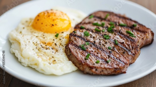Delicious breakfast plate featuring a perfectly cooked steak, fried egg, and herbs on a white plate.