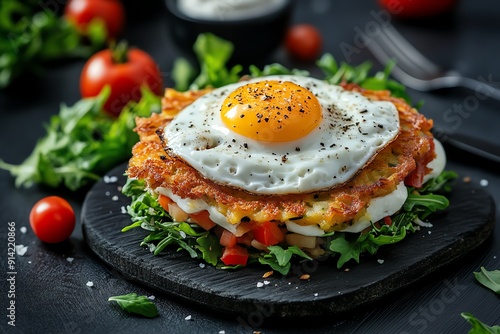 Delicious breakfast with crispy hashbrown topped with sunny side up egg, sliced vegetables, and fresh greens on a dark rustic background.