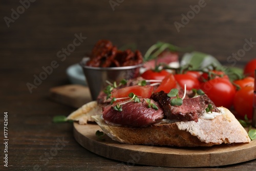 Delicious bruschettas with roast beef served on wooden table, closeup. Space for text