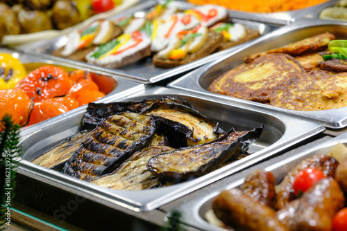 Delicious buffet food spread with grilled eggplant, roasted peppers, and savory pancakes in metal trays.