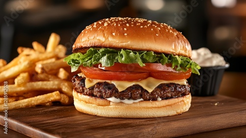 burger, fries, food, eatery, meal, delicious, tasty, deliciously, fast food, sandwich, cheeseburger, beef, meat, sauce, salad, fresh, healthy, serving, portion, ingredient, cooking, kitchen, dining, eating, plate, wooden, board, appetising, menu, comfort, snack, lunch, dinner, fast, cheap, american, cookery, photo, epicure, gourmet food, food photography