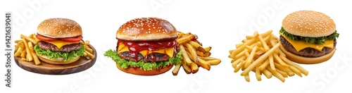 Delicious Burgers and French Fries on on transparent background , png , cutout Classic American Fast Food Meal