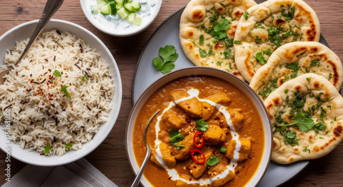 curry, butter, chicken, rice, bread, food, indian, cookery, lunch, dinner, meal, healthy, cooked, traditional, flavorful, spice, tasty, wooden, table, delicious, epicure, serving, eatery, menu, bowl, plate, spoon, top, view, flat, lay, cook, eat, kitchen, fresh, homemade, dish, asian, ethnic, culture, spicey, hot, herb, ingredient, garnish, coriander, cream