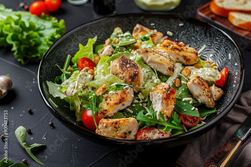 Delicious Caesar Salad! Or a London salad with chicken breast and homemade mayonnaise! Ideal photo for the menu, generative ai
