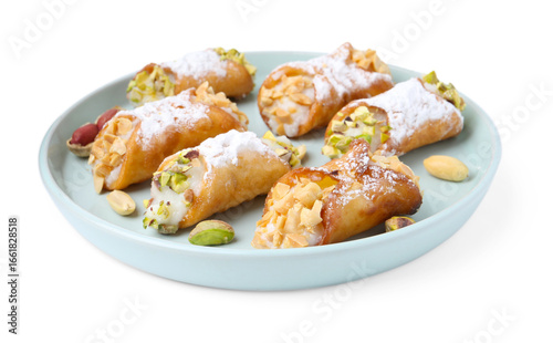 Delicious cannoli with ricotta cheese, peanuts, pistachios and powdered sugar isolated on white