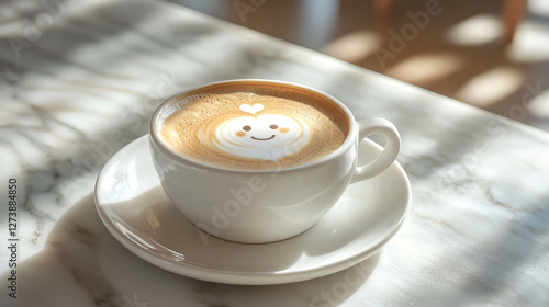 cappuccino, hot drink, latte art, smiley face, beverage, drink, cup, caffeine, morning, espresso, nubes, cute, breakfast, hot, white, table, marble, shadow, sunlight, foam, design, art, cheerful, happy, comfort, relaxation, indulgence, delicious, aroma, wake up
