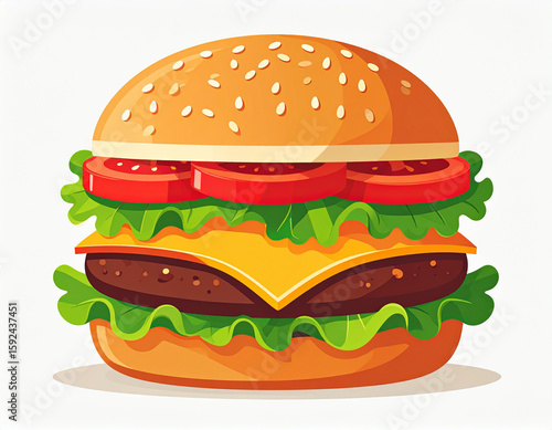 burger, hamburger, cheeseburger, fast, food, illustration, cartoon, drawing, icon, graphic, design, appetising, delicious, junk, meat, patty, cheese, lettuce, tomatoes, sesame, seed, bun, snack, meal, cookery, eatery, cafes, menu, isolated, white, background, clean, simple, vector, clip art