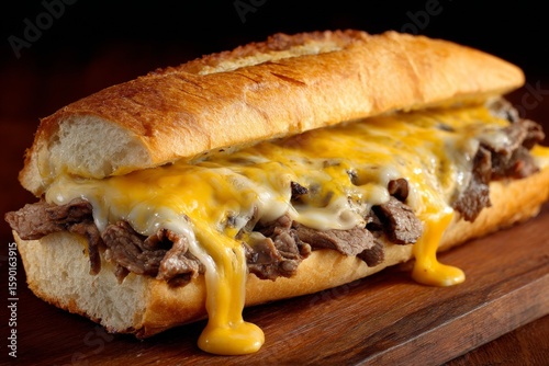 Delicious cheesesteak sandwich with melted cheese on a wooden board
