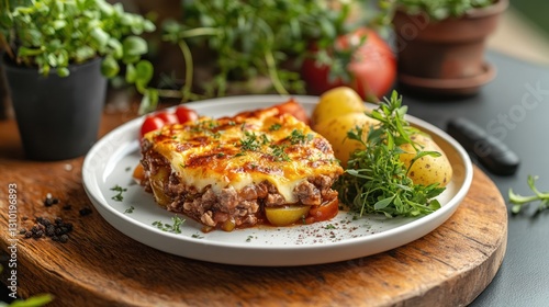Delicious cheesy minced meat casserole served with roasted potatoes and herbs.