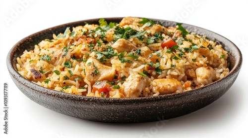 Delicious chicken and rice dish in a dark bowl, garnished with fresh parsley, isolated on white background.