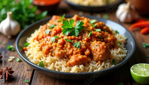 Delicious chicken biryani dish served in plate. Dish composed of cooked rice, flavorful chicken curry. Freshly chopped parsley on top. Meal aromatic, looks delicious. Indian traditional food. Perfect
