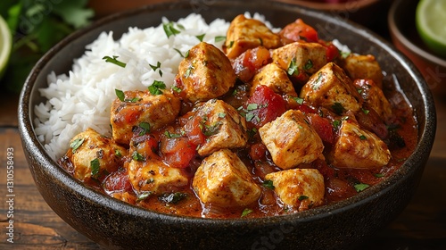 Delicious chicken curry served with fluffy white rice in a rustic bowl.