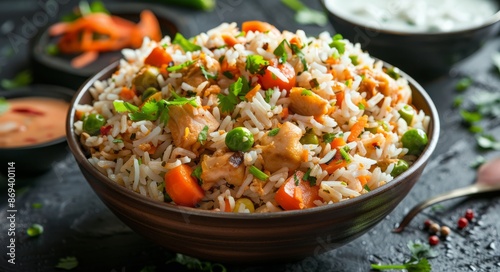fried rice, chicken, rice, carrot, pea, cilantro, asian cuisine, chinese food, dish, food, meal, dinner, lunch, tasty, delicious, healthy, fresh, vegetable, stir fry, cooking, receipe, eat, cookery, asian cuisine, chinese cuisine, eatery, homemade, bowl, plate, table, closeup, appetising, vibrant, colours, texture, favor, aroma, savoury, fragrant