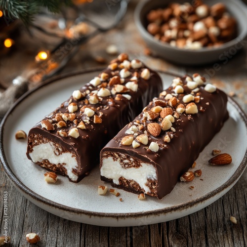 chocolate, almond, dessert, sweet, treat, food, delicious, bar, candy, confectionery, baked, pastry, culinary, epicure, christmas, holiday, festive, winter, snack, brown, dark, creamy, nutty, rich, decadent, sweetness, indulgence, plate, table, wooden, background, photo, still life, closeup, tasty, deliciously, appetising, sweet tooth