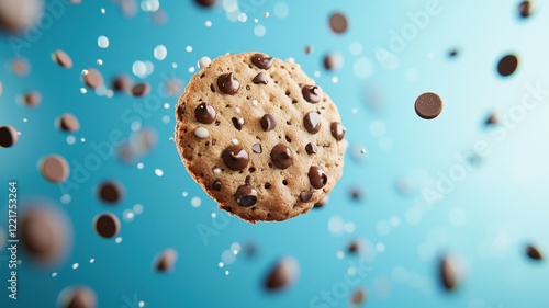 Delicious Chocolate Chip Cookie in Mid Air with Sprinkles and Chocolate Chips Falling Sweet Treat