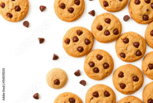 cookie, chocolate chips, baking, food, dessert, sweet, pastry, homemade, delicious, pattern, background, white background, isolated, topview, arrangement, tasty, brown, gold, baked, crunchy, crumbly, texture, snack, treat, bakery, culinary, ingredient, studio shot, copy space, simplicity