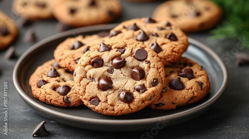 Delicious chocolate chip cookies on a dark plate.