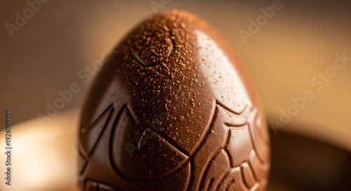 Delicious chocolate easter egg with decorative patterns on its surface closeup