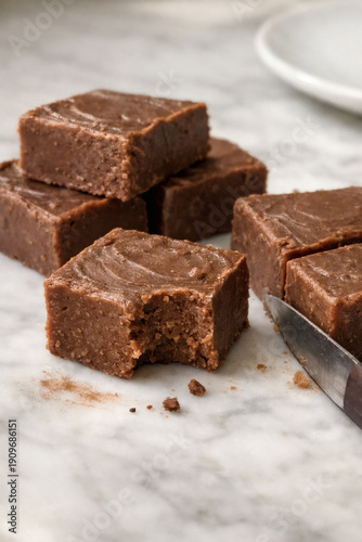 fudge, chocolate, dessert, sweet, treat, square, marble, countertop, closeup, brown, texture, homemade, delicious, confection, indulgence, snack, food, eat, prepare, kitchen, table, plate, knife, stack, swirl