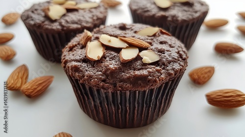 Delicious chocolate muffins topped with sliced almonds sweet treat food cake baked brown snack tasty