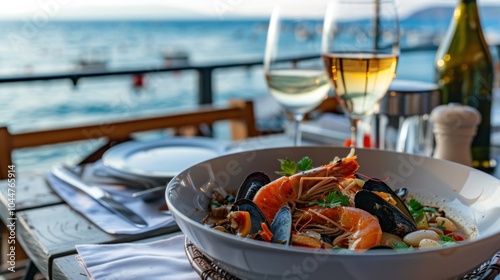 shrimp, seafood, eatery, lunch, food, stylish, mediterranean, coastal, view, plate, fork, healthy, dish, cookery, dinner, italian, meal, cooked, epicure, delicious, fresh, mussel, italy, tasty, sauce, white, pasta, sea, seafood, spaghetti, closeup, parsley, background, clam, prawn, red, fish, shell, table, tomatoes, nourishment, diet, traditional, vegetable, kitchen, ai, generated