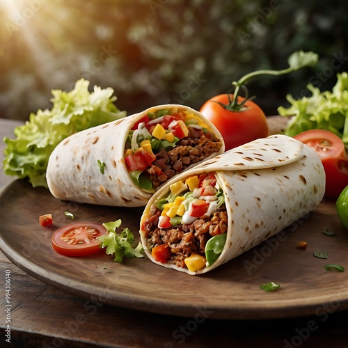 Delicious Classic Burrito with Fresh Ingredients assortment Served with some salad, Tasty delicious burrito wrap roll with meat, pepper, avocado, rice, beans