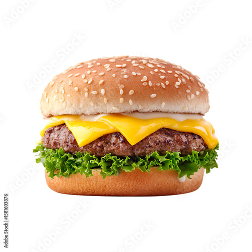 Delicious classic cheeseburger with melted cheese and fresh lettuce on a sesame seed bun isolated on transparent background