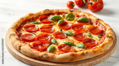 Delicious classic Italian pizza topped with mozzarella, ham, pepperoni, and paprika on a crispy crust, pepperoni, ham, pizza