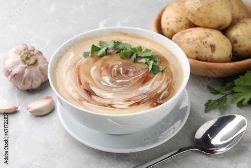Delicious cream soup with soy sauce and parsley served on light grey marble table